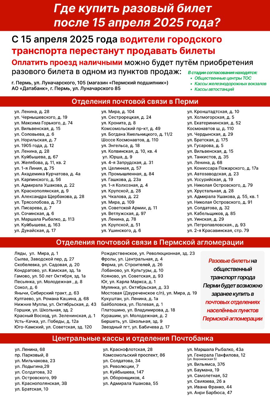 Администрация Перми опубликовала список адресов, где можно будет приобрести за наличный расчёт разовые билеты для проезда в общественном транспорте. Водители автобусов и трамваев с 15 апреля перестанут продавать билеты. Оплата будет возможна только банковской или транспортной картой, проездным или разовым электронным билетом, а также через мобильное приложение.