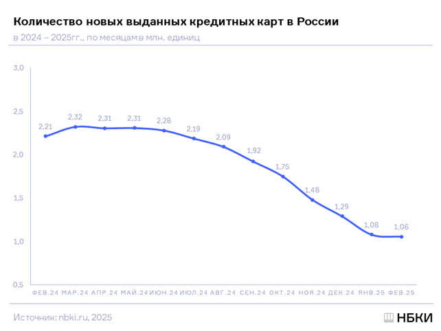 В феврале было выдано 1,06 млн новых кредитных карт, что на 52,3% меньше аналогичного периода прошлого года и на 2,1% меньше, чем в январе. По данным Национального бюро кредитных историй (НБКИ), это наименьшее значение показателя за последний год.