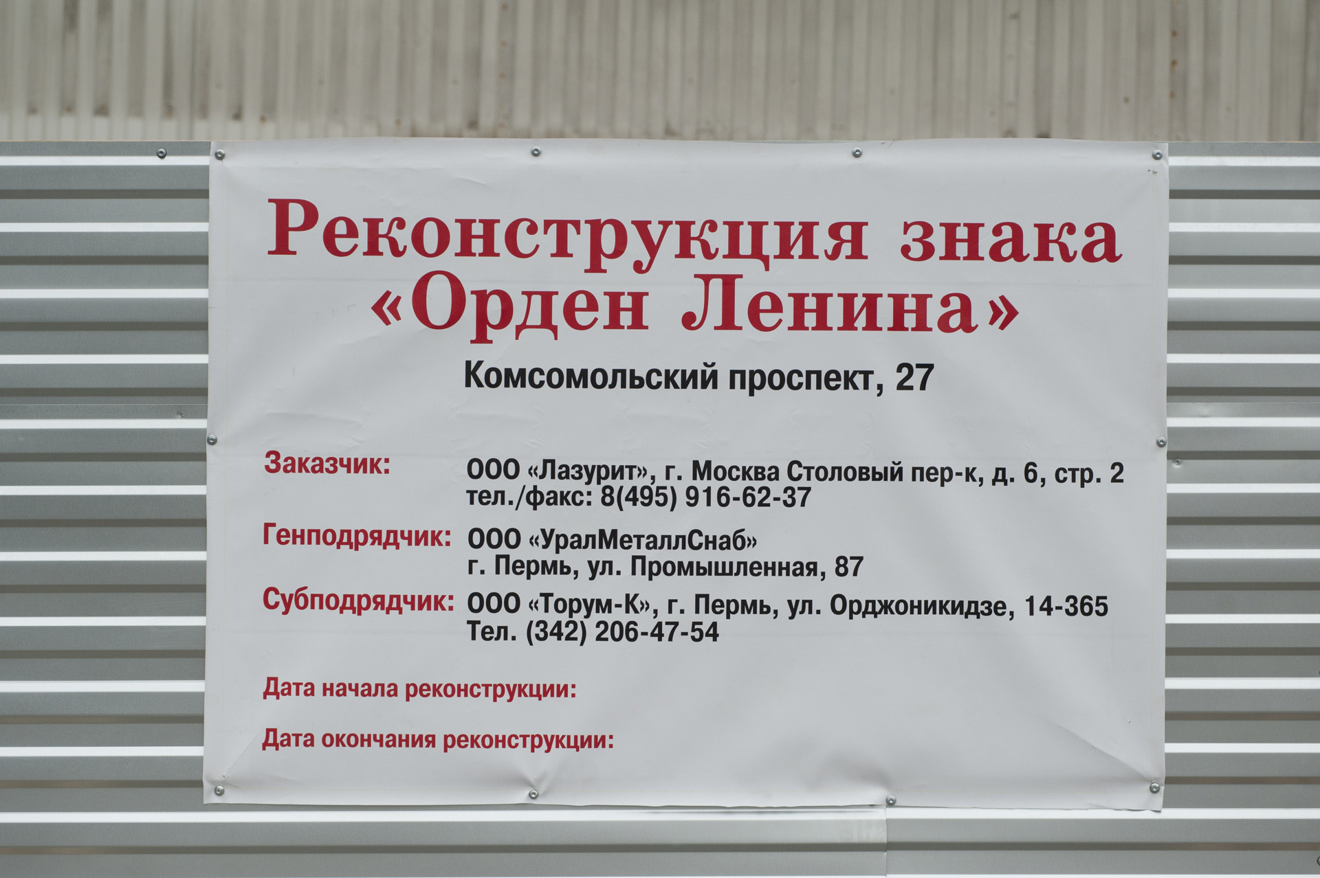 Рабочая группа при главе администрации Перми обсудила 19 августа обстоятельства проведения несанкционированных работ на памятном знаке «Орден Ленина», установленном на перекрёстке Комсомольского проспекта и улицы Екатерининской. На совещании присутствовали представители отеля «Прикамье», на чьей частной территории сейчас расположен памятный знак, глава администрации Ленинского района Перми Николай Истомин, заместитель главы администрации Перми Алексей Грибанов, а также представители двух городских департаментов — градостроительства и архитектуры, а также и культуры и молодёжной политики. Инициатором проведения совещания выступил Анатолий Маховиков, узнавший 16 августа о начале работ по демонтажу памятного знака «Орден Ленин». Как отмечают в мэрии, разрешение на эти работы не выдавалось.