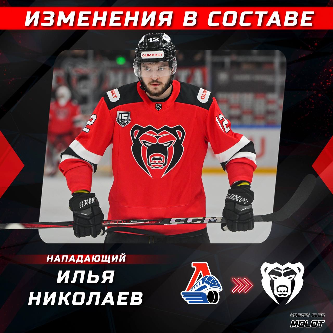 Из системы ярославского «Локомотива» в пермский ХК «Молот» командирован нападающий Илья Николаев. Об этом сообщила пресс-служба пермской команды.
