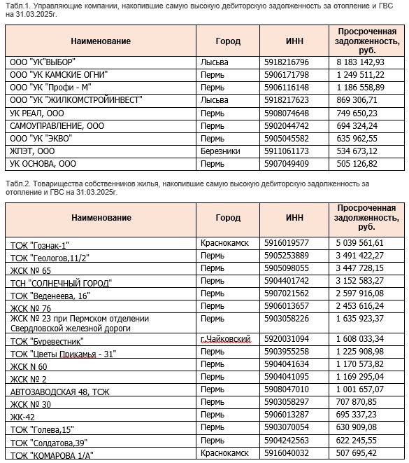 Лидерами списка должников среди УК являются: ООО «УК «Выбор» (Лысьва) (ИНН 5918216796), чья задолженность превышает 8 млн руб.; пермское ООО «Управляющая компания Камские огни» (ИНН 5906171798) с долгом в 1,24 млн руб. и УК «Профи-М» (ИНН 5906116148) — 1,18 млн руб.