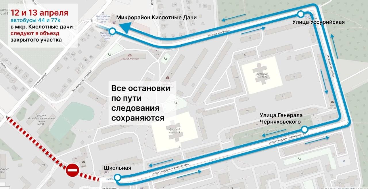 Автобусные маршруты №44 и 77к будут следовать до остановки «Школьная», а после этого проследуют в обратном направлении до остановки «М/р Кислотные дачи». Далее они будут курсировать по маршруту следования.