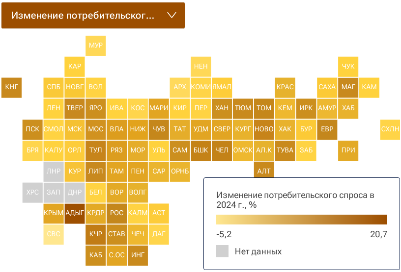 Средний показатель динамики потребительского спроса по РФ по итогам 2024 года сложился на уровне 6,4%. Лидерами стали Республика Адыгея — 20,7% (среднедушевые траты составили 42,3 тыс. руб.), Карачаево-Черкесская Республика — 11,7% (17,3 тыс. руб.) и Республика Башкортостан — 11,2% (40,3 тыс. руб.). Самую нижнюю строчку рейтинга занял Севастополь, единственный субъект с отрицательной динамикой (-5,2%), где сумма среднедушевых потребительских трат составила 25,3 тыс. руб. в месяц.