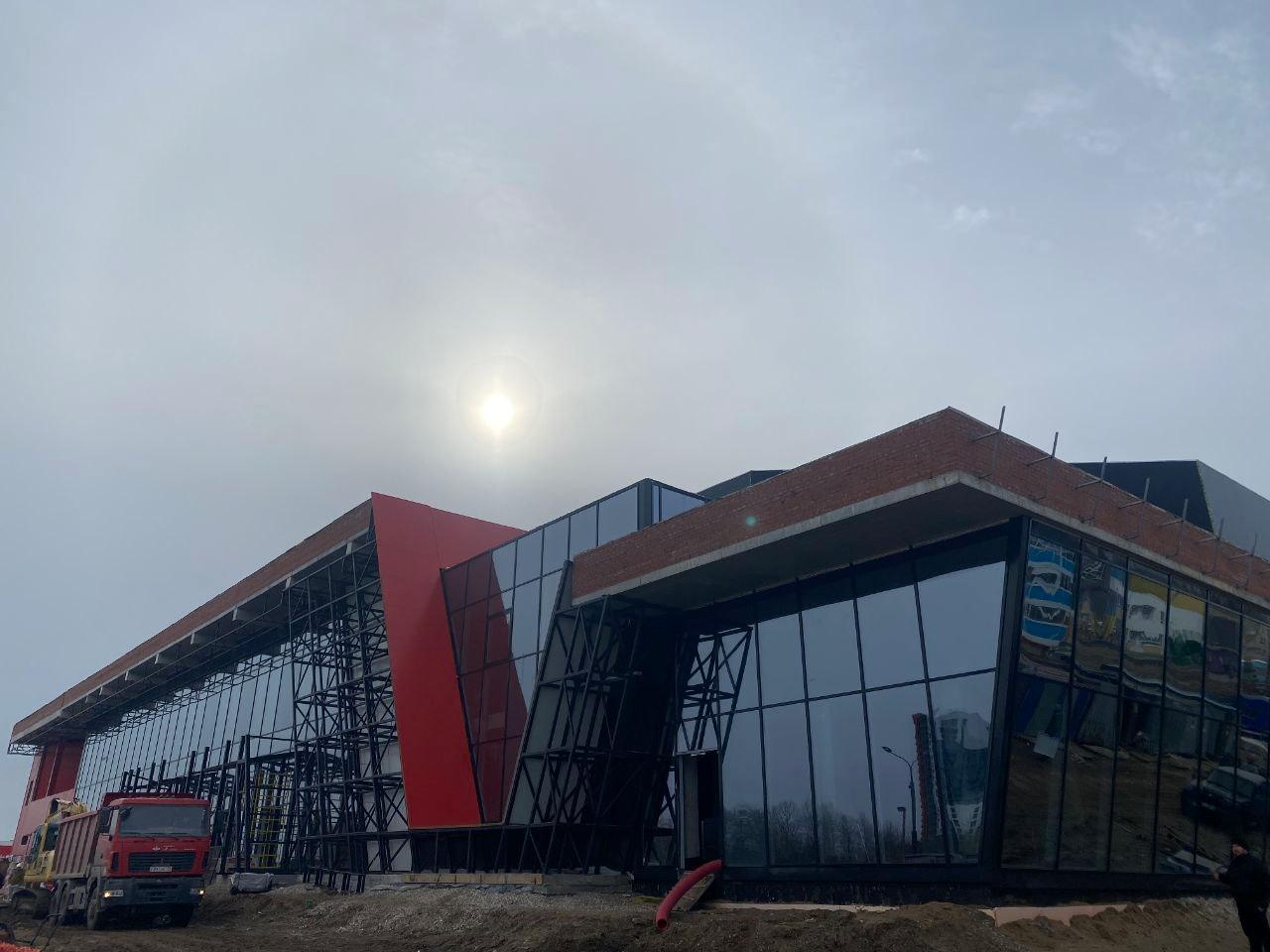В микрорайоне Ива в Перми на возведении крытой ледовой арены завершён важный этап строительства — создан тёплый контур здания (установлена кровля, витражные конструкции, стены, устроены черновые полы).