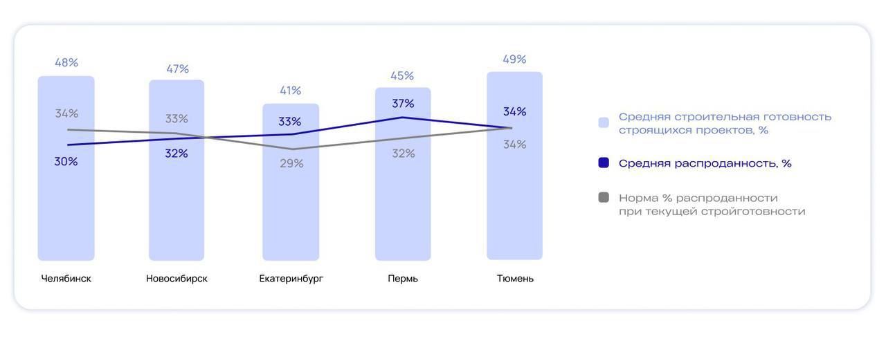 Также Екатеринбург демонстрирует хорошие темпы продаж. Максимально близка к норме Тюмень. Темпы продаж ниже нормы демонстрируют Челябинск и Новосибирск.