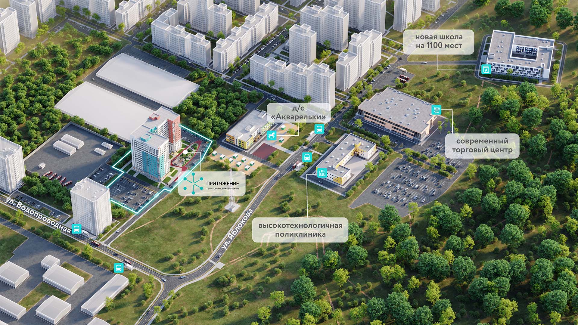 В доме запроектировано авторское лобби с уютной мягкой зоной отдыха и коворкингом, колясочной, комнатой матери и ребенка и уникальным игровым пространством для самых маленьких, где дети начнут адаптироваться комфортно к окружающему. Вокруг жилого комплекса будут обустроены пешеходная улица и велодорожка, а для хранения взрослого транспорта – крытый уличный bike-box для хранения взрослого транспорта.