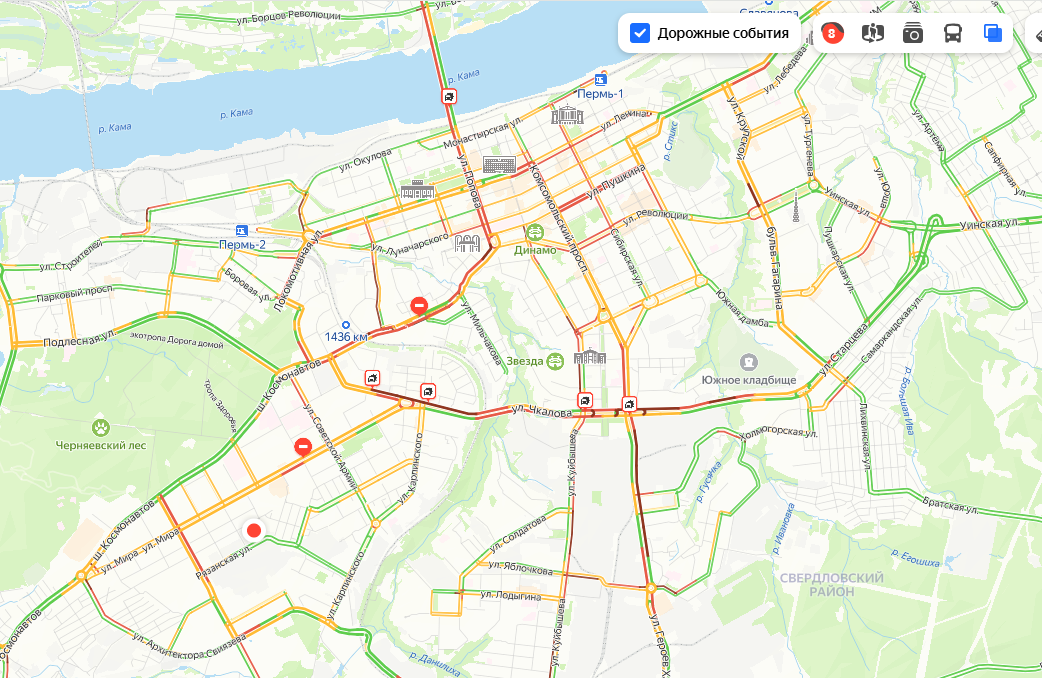 По данным "Яндекс.Пробки", в городе зафиксированы пять аварий, четыре их которых на Чкалова — Стахановской, а одна на Коммунальном мосту. Краевая столица встала в пробках в восемь баллов.