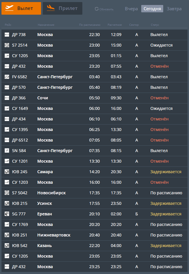 В Перми растёт количество задержанных и отменённых авиарейсов. По данным онлайн-табло аэропорта Большое Савино, на данный момент в Москву отменены 6 самолётов до столичных Внуково и Шереметьево, которые должны были вылететь в 23:20 6 мая (ДР 432), а также в 6:10 (ДР 434), 6:25 (СУ 1395), 7:05 (ДР 6512), 13:30 (СУ 12:01) и 16:00 (СУ 1203) 7 мая. Отменён рейс до Сочи.