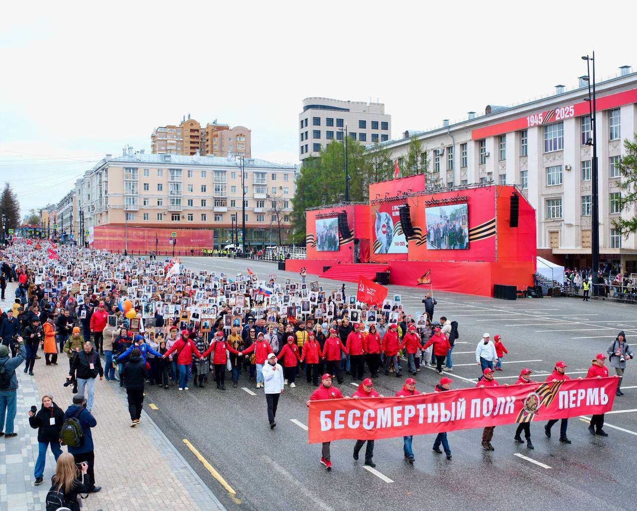 Впервые с 2022 года в ознаменование 80-й годовщины Великой Победы народное шествие «Бессмертный полк» в Перми состоялось в реальном формате. Оно прошло 9 мая после торжественного парада войск Пермского гарнизона по Комсомольскому проспекту, Октябрьской площади, ул. Ленина до главной сцены у Театра-Театра. В рядах колонны шли более 50 тыс. человек, неся транспаранты и фотографии своих родных и близких, участвовавших в Великой Отечественной войне, об этом сообщили местные власти.