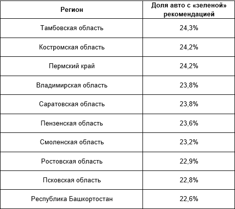 По словам управляющего директора «Автотеки» Андрея Тумкина, по итогам исследования более чем в 40 российских регионах доля автомобилей с «зелёными» рекомендациями оказалась выше средней.