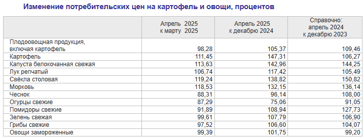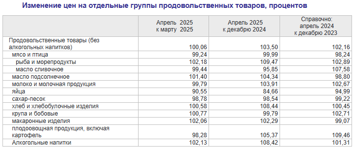 В апреле значительно выросли цены на баранину (на 5,1%), сосиски и сардельки (на 3,9%), живую и охлаждённую рыбу (на 6,5%), кальмаров (на 5,7%), замороженную рыбу (на 2,2%) и сельдь (на 2,1%). Подорожали также детские творожки (на 8,1%), сметана (на 4%), детское молоко (на 2,6%), национальные сыры и брынза (на 2,6%). Кроме того, выросла стоимость фруктово-ягодных консервов для детского питания (на 4,5%), печенья (на 3,9%), мягких шоколадных конфет (на 3,8%) и шоколада (на 3,7%), варенья, джема и повидла (на 2,5%), а также макаронных изделий (на 2,1%).
