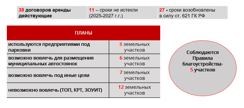 По данным чиновницы, в прошлом году представители администрации провели встречи с предпринимателями-арендаторами участков под автостоянки. Было решено, что перечень элементов автостоянки будет разделён на основные и дополнительные. Всего в перечне дорожной карты 51 участок. В настоящее время у администрации заключены 38 договоров на предоставление земельных участков в аренду.