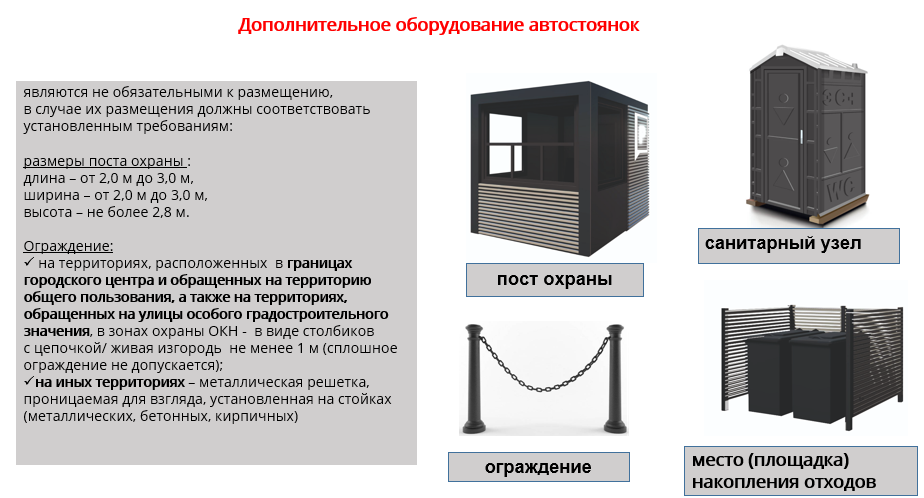К основным элементам автостоянки будут относиться вид покрытия (асфальт, бетон, щебень, иное твёрдое покрытие, озеленённые полосы) и осветительное и информационное оборудование, а к дополнительным — ограждение территории по периметру, пост охраны, место (площадка) накопления отходов и санузел. При этом поступило предложение исключить пункт о разделительных элементах (разметка машино-мест).