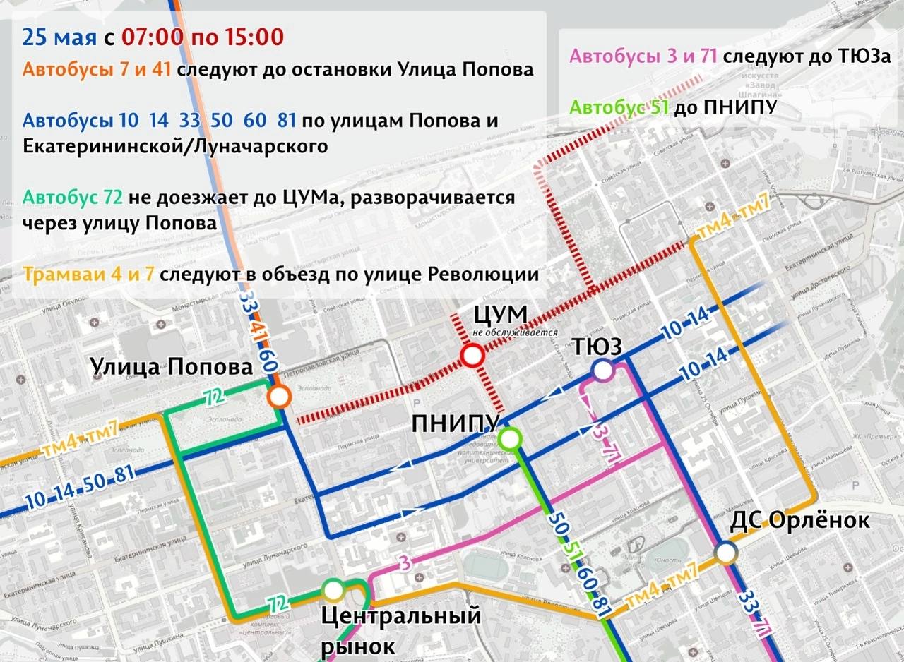 Маршруты №10, 14, 33, 50, 60 и 81 будут объезжать закрытый участок по улицам Екатерининской, Луначарского и Попова.