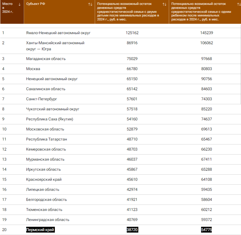 Потенциально возможный остаток денежных средств среднестатистической семьи с двумя детьми после минимальных расходов за месяц в 2024 году в Пермском крае составил 38,7 тыс. руб., в семье с одним ребёнком — 54,7 тыс. руб. Годом ранее показатели составляли 47,9 и 62,5 тыс. руб., при этом Прикамье занимало 23-ю строчку рейтинга.