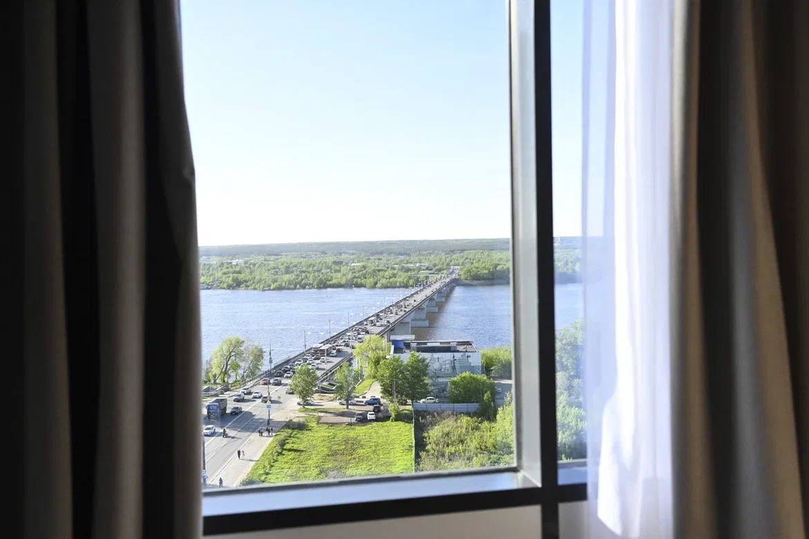 Пятизвёздочный 20-этажный отель Radisson на углу улиц Попова и Монастырской располагает 158 номерами разных категорий – от «стандарт» до «премиум», есть также президентский люкс на 18-м этаже, но он пока недоступен для бронирования: готовы для приёма гостей только номера, расположенные с пятого по восьмой этажи. Отель очень торопился открыться к началу летнего фестивального сезона, и в настоящий момент все доступные номера уже забронированы. В отдельную ценовую категорию выделены видовые комнаты с панорамными окнами, выходящими на Каму.