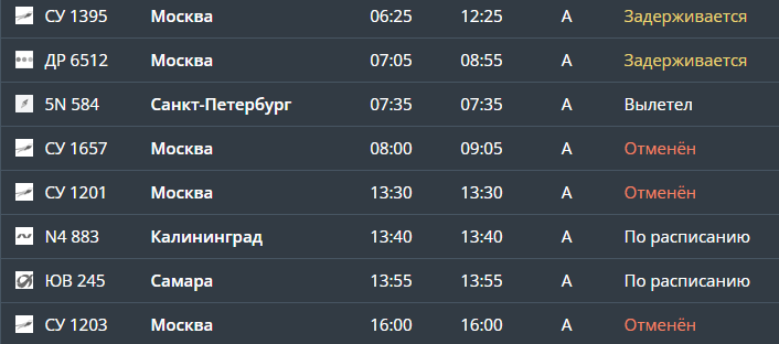 Как следует из данных онлайн-табло, были отменены два рейсы авиакомпании «Аэрофлот» СУ-1657 и СУ-1201, которые должны прибыть в столичный аэропорт Шереметьево.