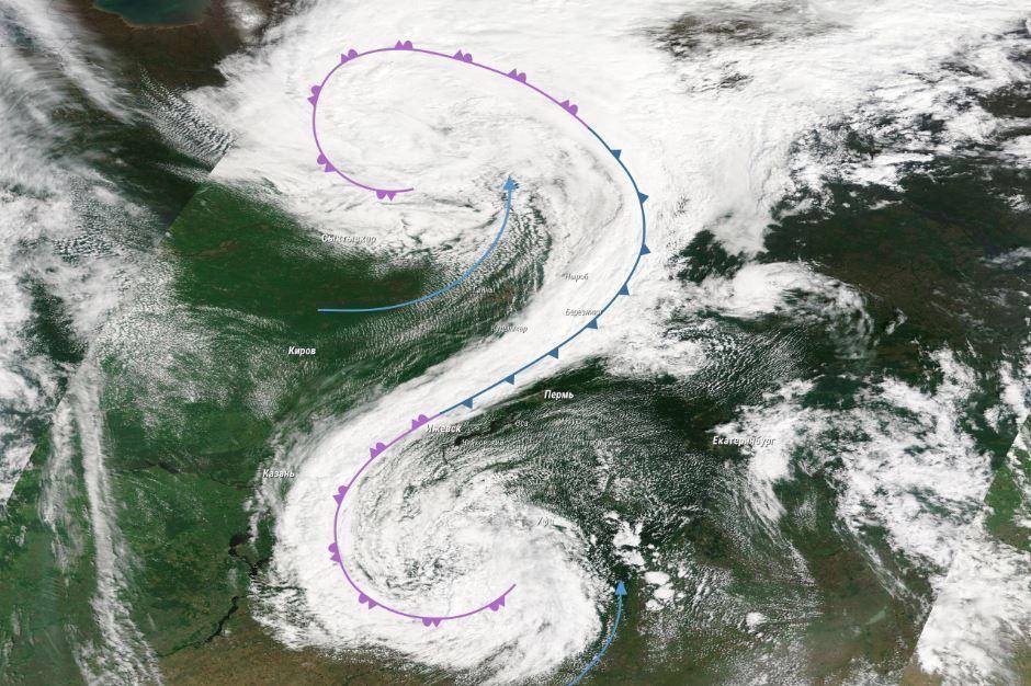 При этом резких перепадов температуры уже не наблюдается, однако облачная структура всё ещё сохраняется по инерции. Это происходит при заполнении циклонов, когда у поверхности земли признаки явных фронтов исчезают, но фронтальная облачность продолжает существовать ещё несколько дней и остаётся видимой из космоса, уточнили специалисты.