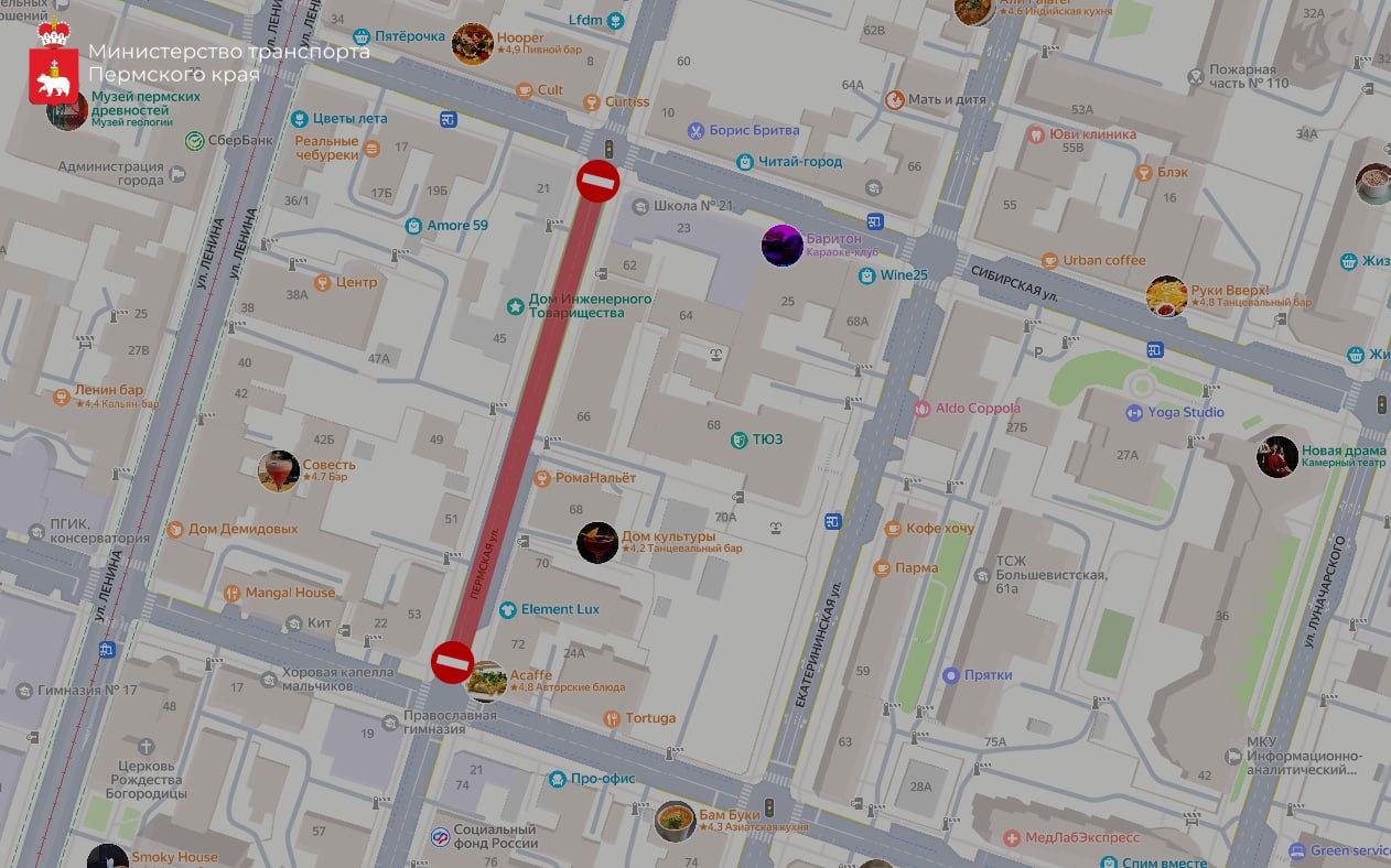 В Центре безопасности дорожного движения Пермского края сообщили, что причина перекрытия — проведение мероприятия «Музыкальный квартал» и ярмарки. Организаторами выступили администрация Перми и МАУК «ПермьКонцерт».