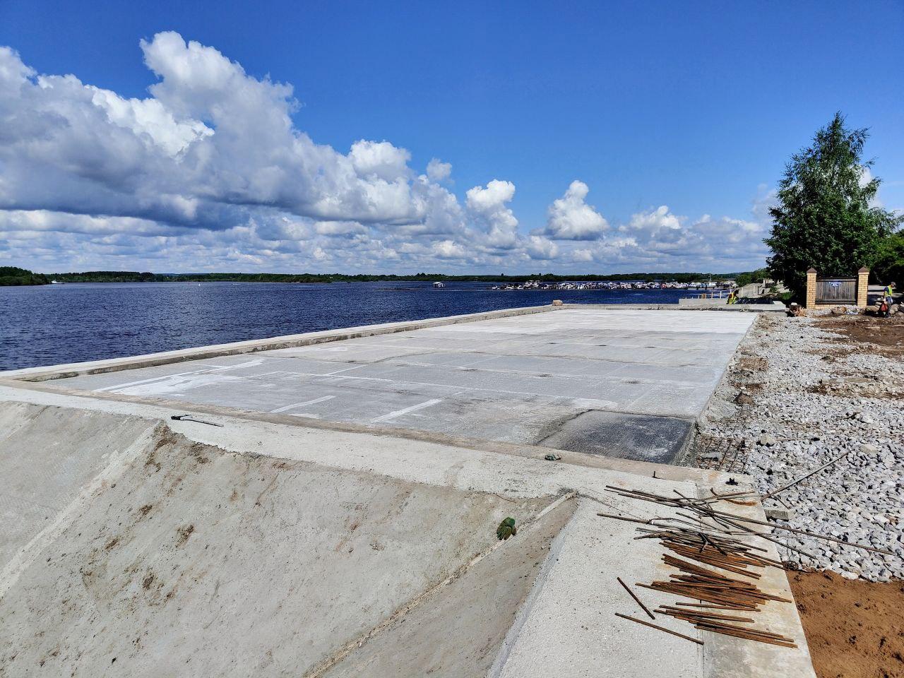 Основная обзорная площадка получила бетонное покрытие, также была налажена система водоотведения. В настоящее время ведётся установка бордюрного камня и готовится основание для тротуарной плитки.
