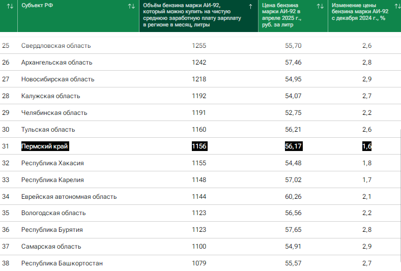 В рейтинге российских регионов по доступности бензина Прикамье заняло 31-е место, что на две позиции выше, чем летом 2024 года. Рейтинг составлен аналитиками РИА Новости из расчёта средней заработной платы в регионе на среднюю стоимость литра бензина марки АИ-92. Список ранжирован от большего объёма топлива, которое можно приобрести на среднюю зарплату, к меньшему.