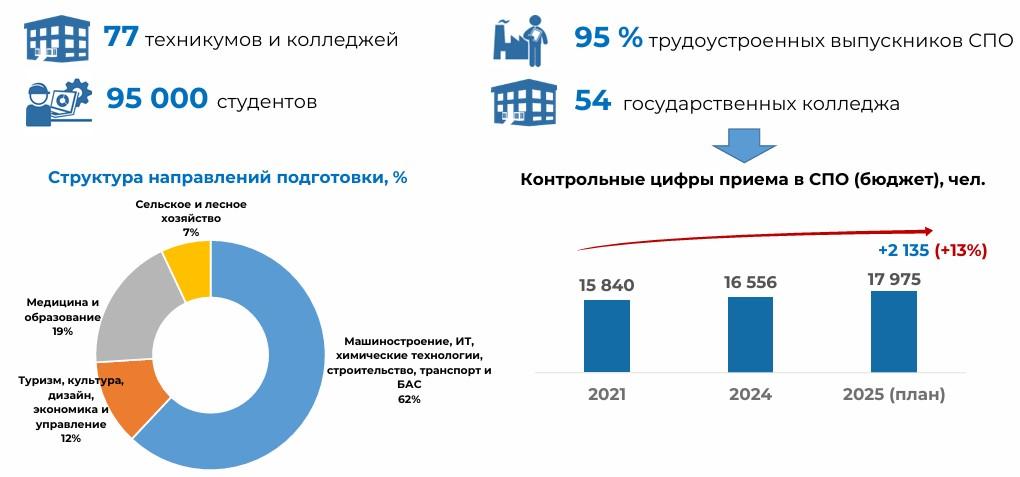 «У нас 77 техникумов и колледжей. Абсолютное большинство из них государственные. В общей сложности это 95 тыс. студентов. По специальности устраиваются 95% выпускников», — сказала чиновница.
