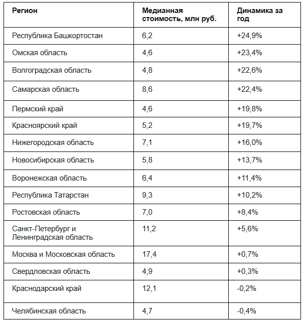 Лидером по количеству предложений частных домов среди регионов-миллионников является Краснодарский край, на который приходится 38,1% всех объявлений. Далее следуют Московский регион (22,5%) и Ростовская область (14,4%). Самая высокая стоимость квадратного метра зафиксирована в Москве и Московской области (115 тыс. руб.). Наряду с Пермским краем, наиболее доступные цены на квадратный метр также отмечены в Волгоградской (51 тыс. руб.) и Омской (54 тыс. руб.) областях.