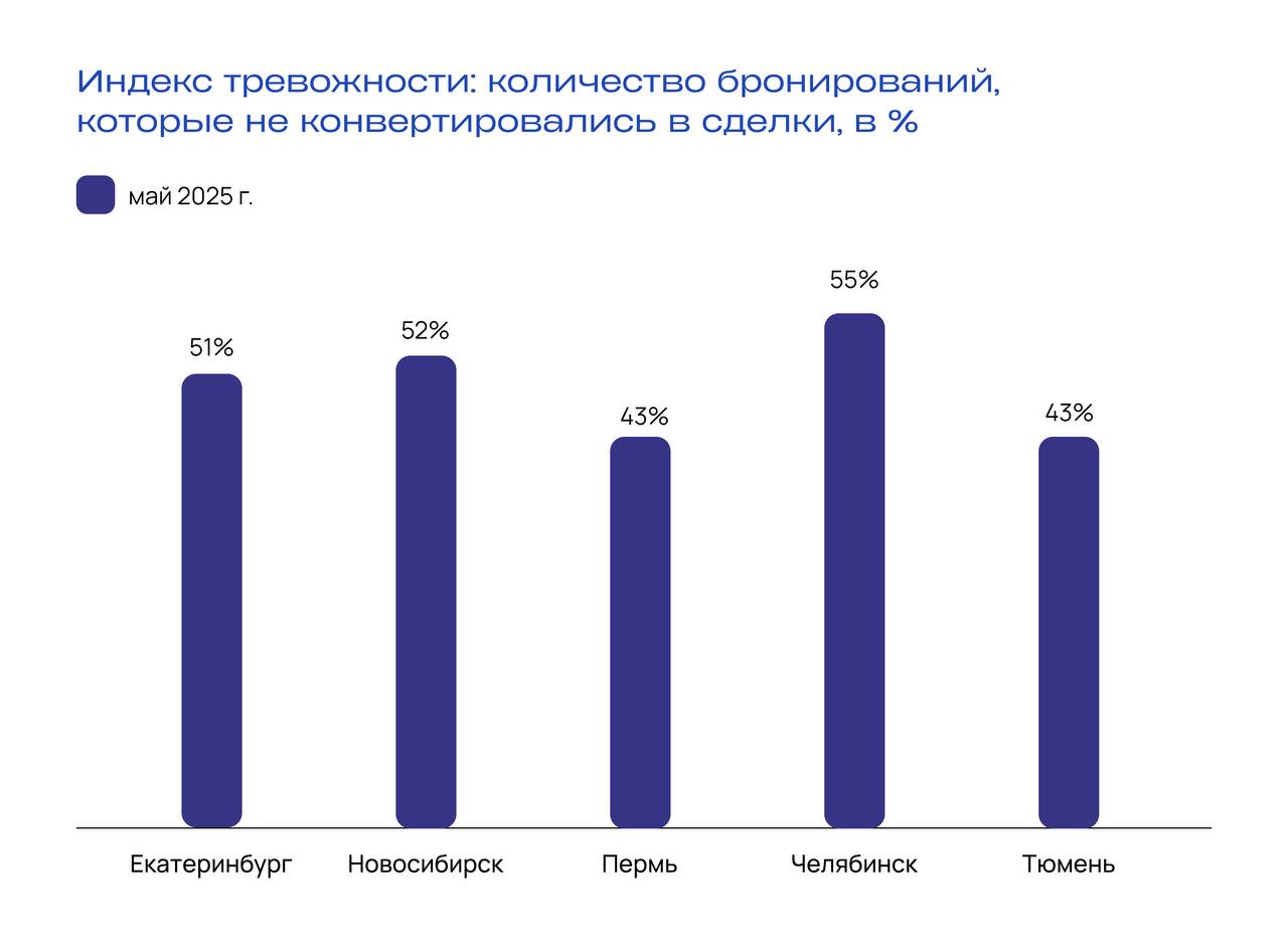 Наиболее высокий уровень индекса тревожности в мае 2025 года зафиксирован в Челябинске, где 55% граждан, зарезервировавших жильё, не стали его приобретать. На втором месте Новосибирск с показателем 52%, а на третьем — Екатеринбург с 51%. Более уверенными и устойчивыми к стрессу в конце весны 2025 года оказались покупатели в Перми и Тюмени: в обоих этих городах индекс тревожности составил 43%. Тем не менее и он вырос по сравнению с мартом 2025 года. Тогда в Перми этот показатель равнялся 38%.