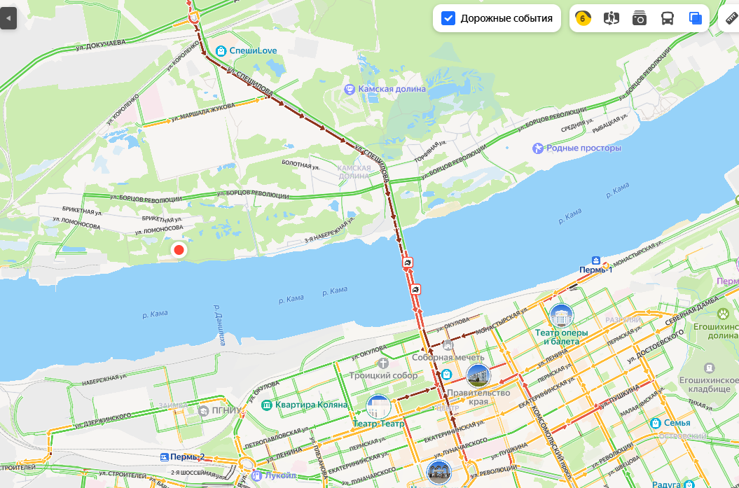 Движение затруднено на протяжении всей ул. Спешилова в Камской долине по пути в центр — от кольца в Сосновом бору.