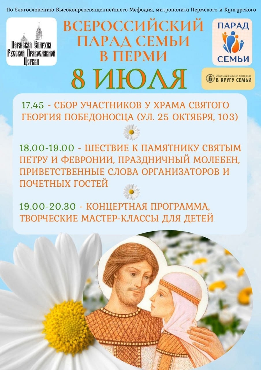 В День семьи, любви и верности множество людей по всей стране примут участие в семейных шествиях под девизом «Россия — Семья Семей!». В Перми Крестный ход стартует от храма святого Георгия Победоносца к памятнику Святым Петру и Февронии в 18:00 (сбор в 17:45). С 19:00 до 20:30 состоится концертная программа и творческие мастер-классы для детей.