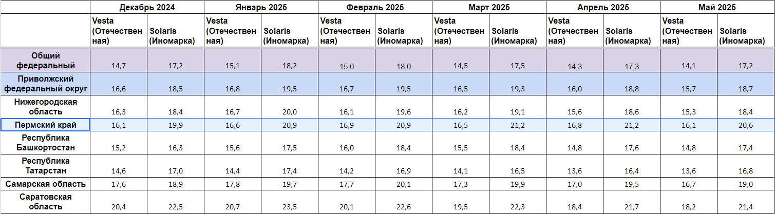 В мае 2025 года средняя цена Lada Vesta в России составила 1,06 млн руб., что на 3,5% ниже, чем в декабре. Стоимость Hyundai Solaris почти не изменилась и составила 1,29 млн руб. Уровень зарплат тоже практически не изменился, оставшись в размере 75 тыс. руб.