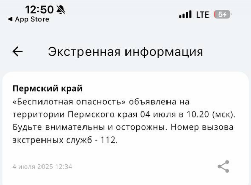 «Беспилотная опасность объявлена на территории Пермского края 4 июля в 10:20 (мск). Будьте внимательны и осторожны», — говорится в уведомлении, которые получили жители.