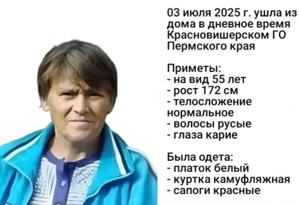 Речь идёт о 53-летней жительнице п. Вая, расположенного в Красновишерском округе. Её исчезновение заметили вечером 4 июля. Свой дом она покинула 3 июля, и с тех пор её местонахождение неизвестно.