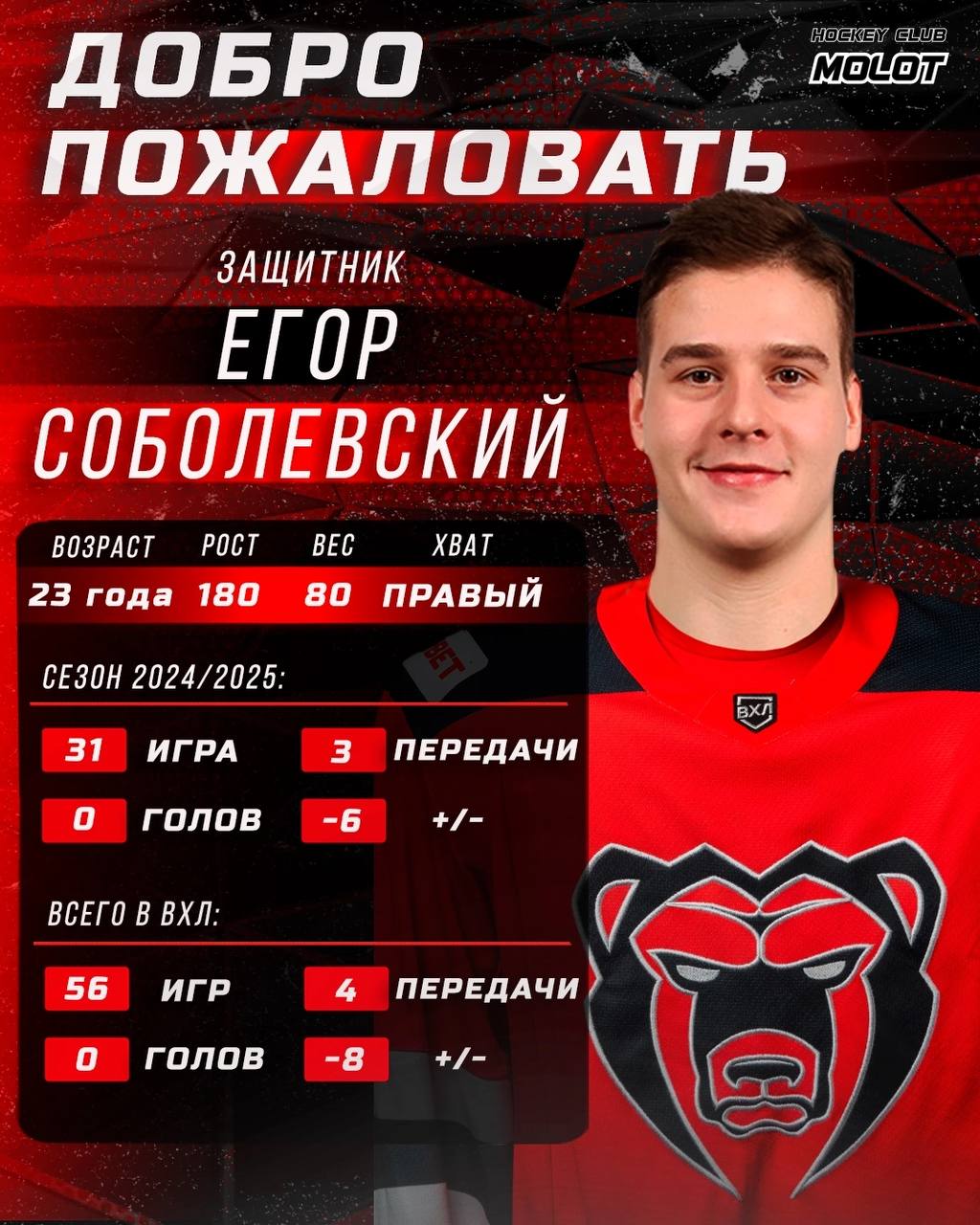 Пермский хоккейный клуб «Молот» заключил соглашение с защитником Егором Соболевским, воспитанником питерской хоккейной школы. На протяжении большей части игровой карьеры он выступал за команды системы питерского СКА.