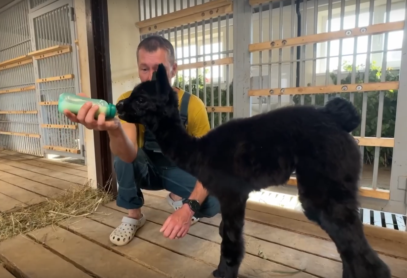 Сотрудникам зоопарка самим пришлось выкармливать детёныша. Позднее Кляксу интегрировали в группу, и взрослая альпака Мира взяла над ней опеку.