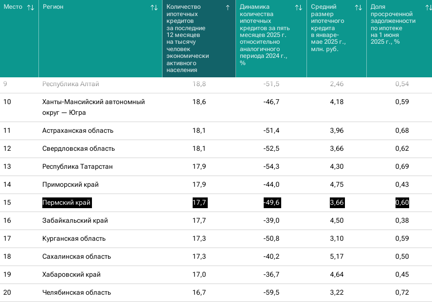 Прикамье потеряло три позиции в рейтинге российских регионов по развитию ипотеки за последние 12 месяцев. По данным РИА Новости, Пермский край опустился с 12 на 15 место.