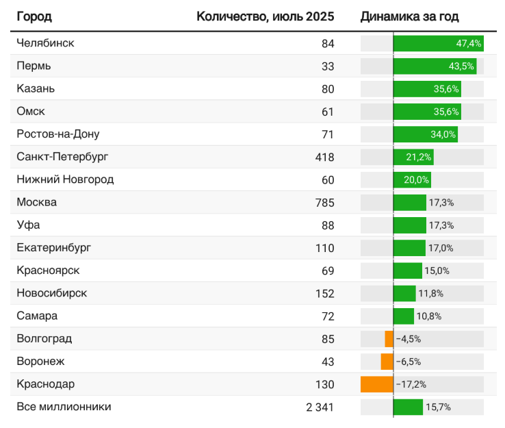 Наиболее значительный скачок в количестве фреш-баров был отмечен в Челябинске (прирост на 47%, 84 точки), Перми (+44%, 33 точки) и Казани (+36%, 80 точек).