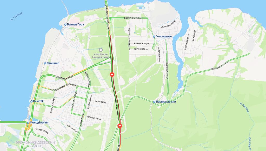 На самом Чусовском мосту движение относительно свободное — участок на «Яндекс Картах» подсвечен жёлтым цветом. После проезда моста затора нет. При этом информации о том, что могло послужить причиной пробки, на картах нет.