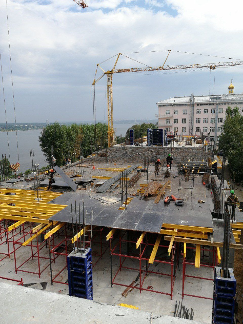 На ул. Окулова, 4 в Перми продолжается возведение гостиничного комплекса. Согласно информации от генерального подрядчика, уже завершается формирование монолитного каркаса третьего этажа будущей гостиницы.