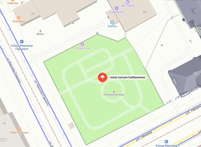 Сквер Грибушиных расположен возле перекрестка улиц Горького и Ленина рядом с особняком Грибушина.