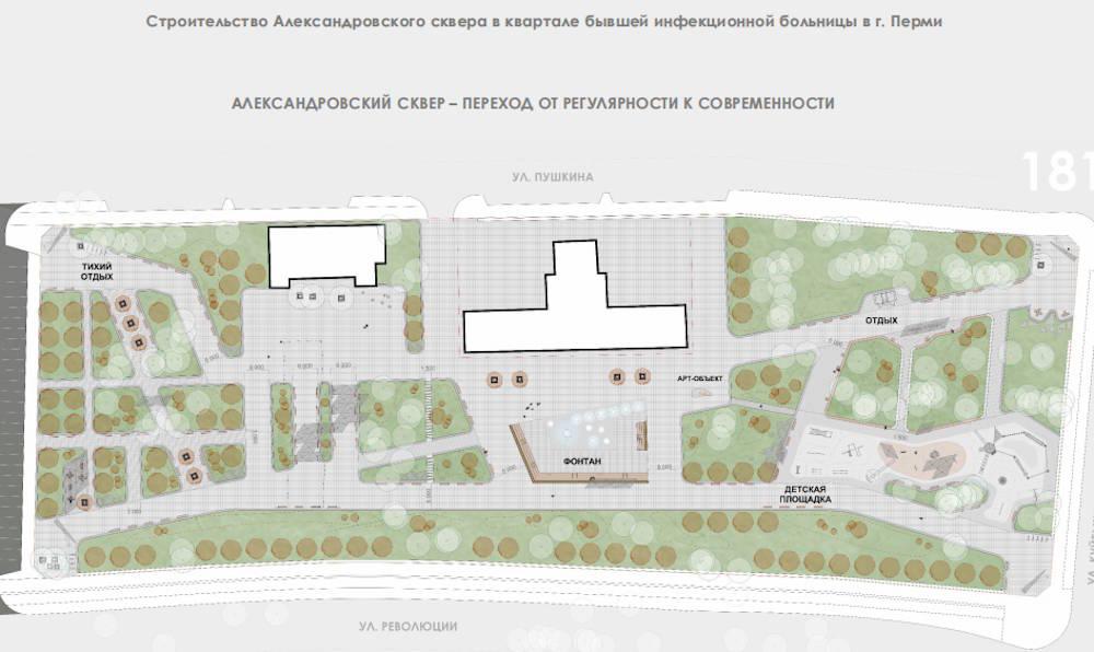 Для обустройства Александровского сквера на территории, где ранее располагалась Пермская краевая инфекционная больница (между Центральным рынком, улицами Пушкина, Революции и Куйбышева), выделили 488,5 млн руб. Управление автодорог и транспорта Пермского края объявило о поиске компании, которая займётся созданием нового места отдыха в центре Перми. На публикацию на портале закупок обратил внимание «Рифей».