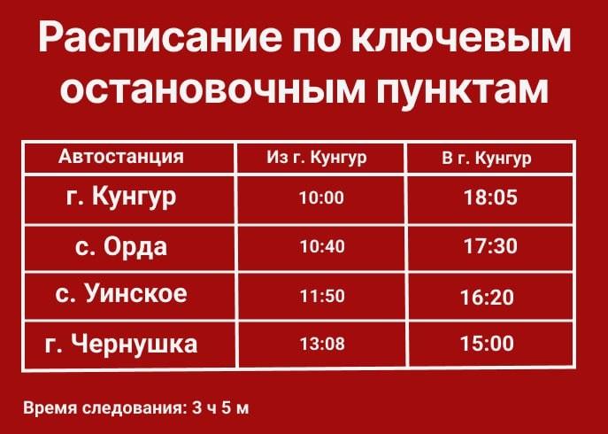 Отправление из Кунгура запланировано на 10:00, прибытие в Чернушку — в 13:08. Обратный рейс из Чернушки в Кунгур будет отправляться в 15:00.