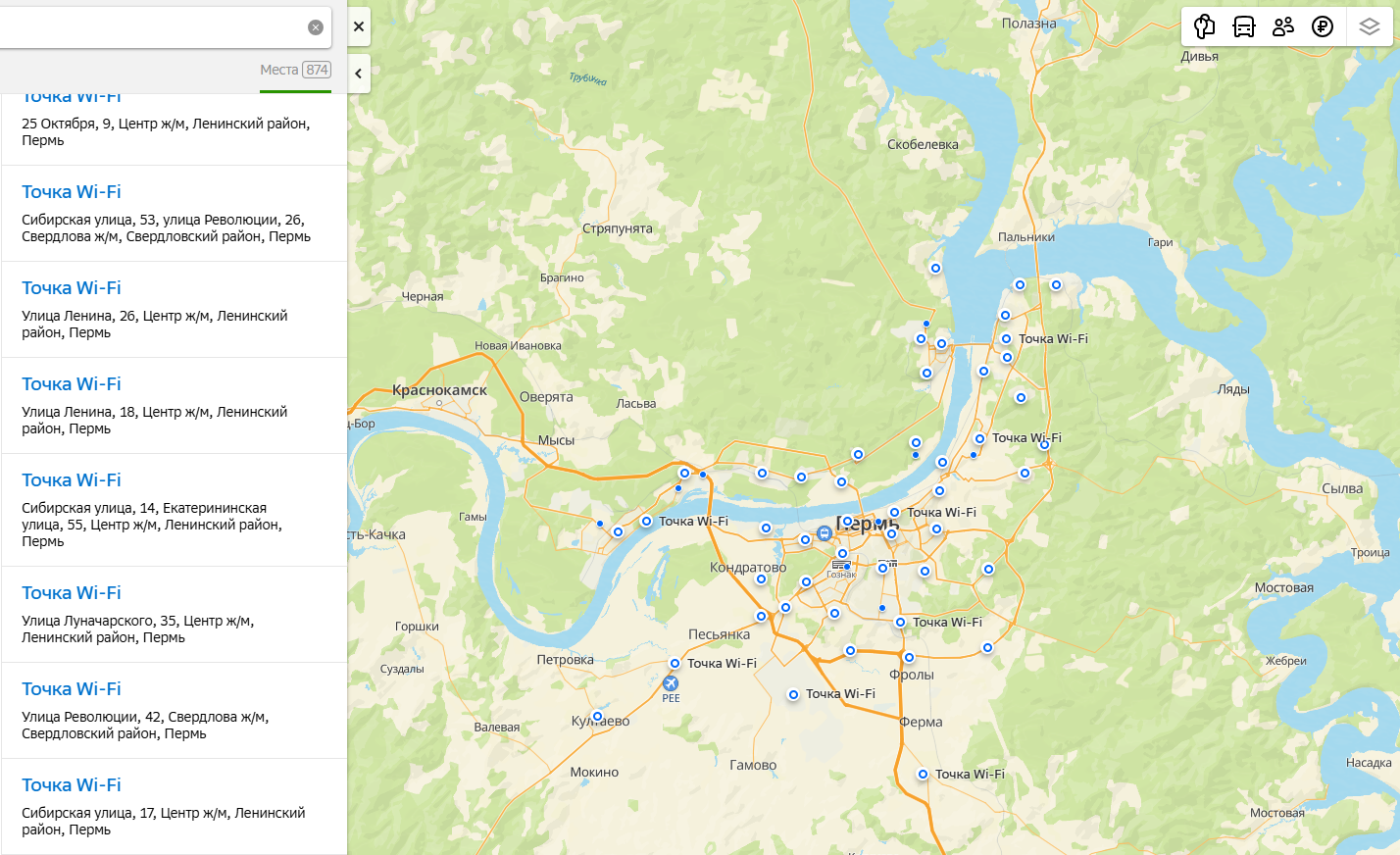 Картографический сервис 2ГИС начал отображать местоположение публичных Wi-Fi точек в 17 городах России, включая Пермь. В Перми на карте отображено около 1 тыс. подобных точек доступа, расположенных в различных местах, таких как остановки общественного транспорта, кафе, торговые центры, парки, библиотеки и культурные учреждения.