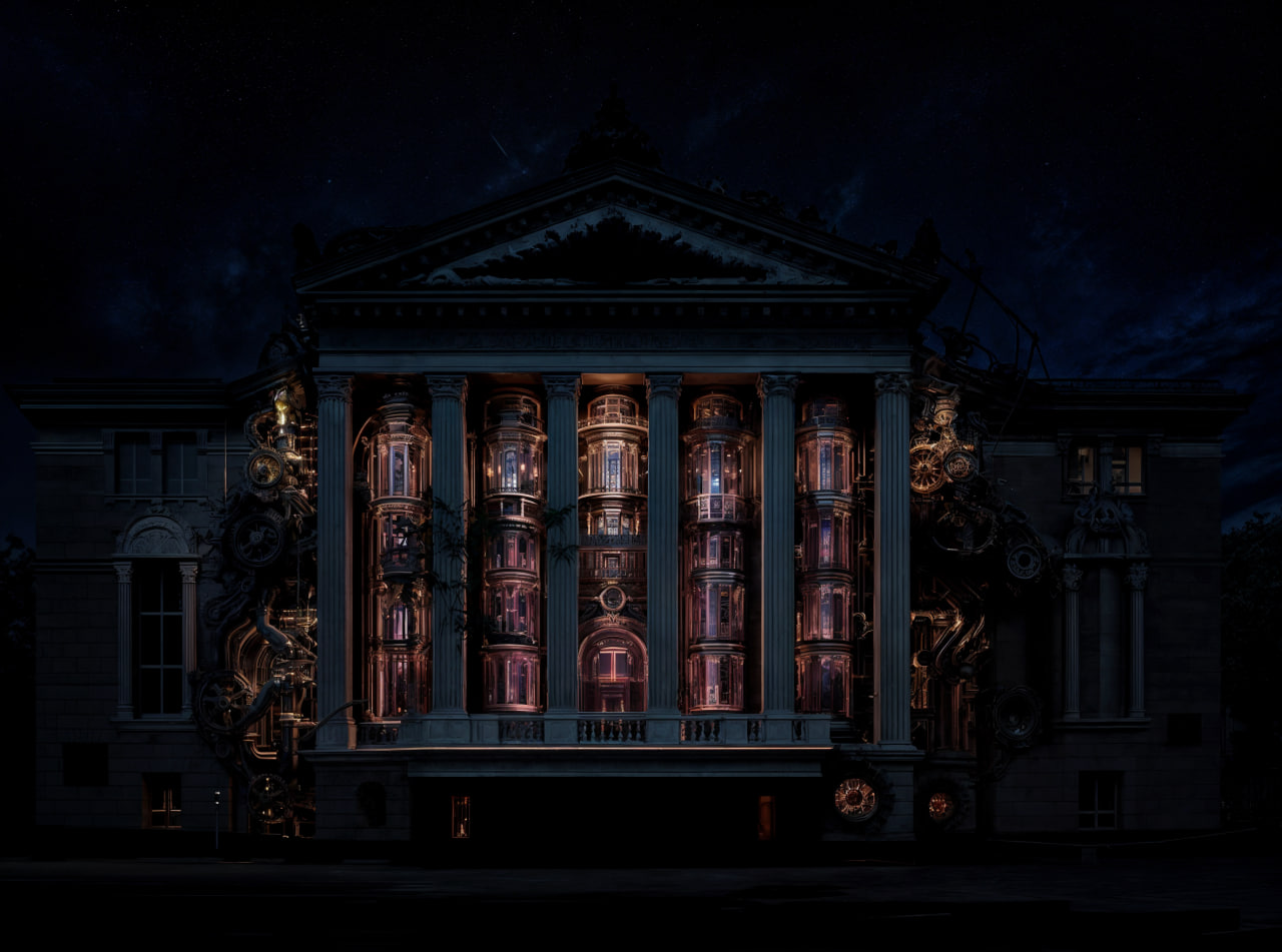 Работа студии metaphora «Механика ветров» — масштабный видеомэппинг, превращающий фасад театра в живой механизм: колонны становятся колбами, карнизы — шестернями, а вихри света и тени рождают на камне бесконечную легенду. В этом поэтичном симбиозе живой художник и искусственный интеллект выступают соавторами, сплетая науку, технологию и природу в единую ткань образов: каждая вспышка словно улавливает невидимое дыхание мира, заставляя здание оживать и рассказывать историю о том, как в гармонии могут сосуществовать стихия, человек и машина.