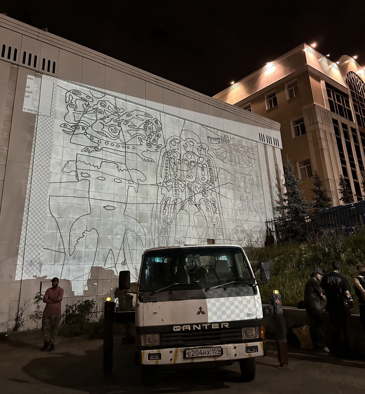 Новая фреска расположена на электросетевом объекте «Россети Урал» — во дворе дома по ул. Екатерининской, 98. Уже завершена разметка, и видно, что сюжет составят изображения пермского звериного стиля. По условиям фестиваля, все работы художников должны быть посвящены пермским культурным и историческим феноменам.