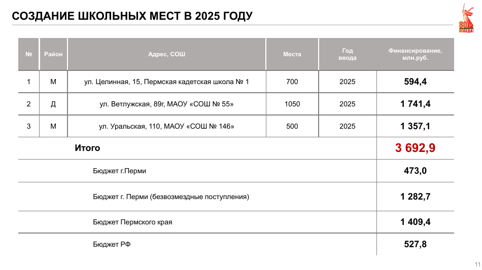 На создание новых мест в школах столицы Прикамья в 2025 году выделено 3,7 млрд руб. Места появятся в новых корпусах Пермской кадетской школы (700 мест), в школе № 55 (1050 мест) и в школе № 146 ( 500 мест). Об этом на пленарном заседании гордумы Перми рассказала замглавы администрации Екатерина Мальцева. Чиновница представила доклад о готовности образовательных учреждений к новому учебному году 2025/26.