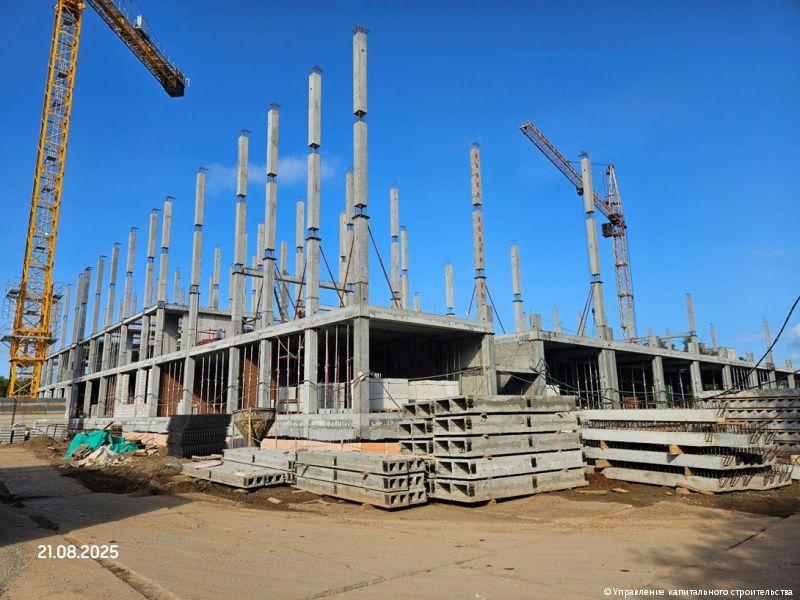 На текущий момент на объекте, расположенном на ул. Свиязева, уже завершены работы по созданию каркаса здания и обустройству кровли административно-бытового блока. Кроме того, завершена забивка свай под основное здание школы, произведён монтаж колонн первого этажа и установлены цокольные панели. В настоящее время подрядная организация занимается монтажом плит перекрытий, кладкой кирпичных стен и возведением перегородок на первом этаже, а также приступила к установке колонн второго яруса. Ведутся работы по гидроизоляции и утеплению подвальных помещений, устройству полов в подвале, прокладке канала теплотрассы и монтажу системы отопления.