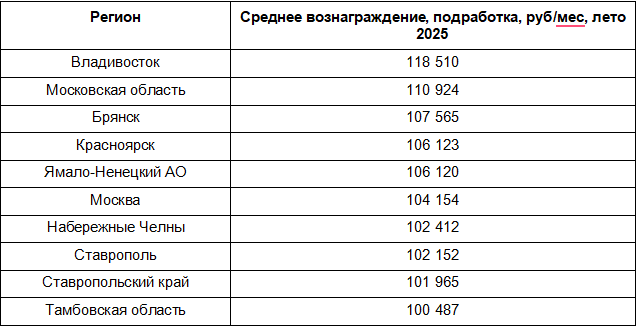 Регионы с наиболее высокими вознаграждениями за частичную занятость (лето 2025 года):