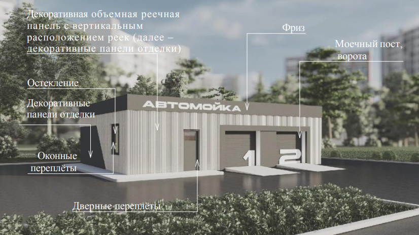 Документом предлагаются три варианта отделки павильонов в белых и серых оттенках. Объекты должны быть не менее 8 и не более 25 м длиной, не менее 6 и не более 15 м шириной, а также не более 6 м высотой, выполнены из несущих сварных металлических конструкций, с простым прозрачным остеклением с антивандальным покрытием, без тонирования. Панели для отделки фасадов должны быть металлическими или композитными, для идентификации допускается использование типовых знаков в виде шланга, капли с отражением автомобиля, геометки, мыльных пузырей и подобных изображений из металла или композита.