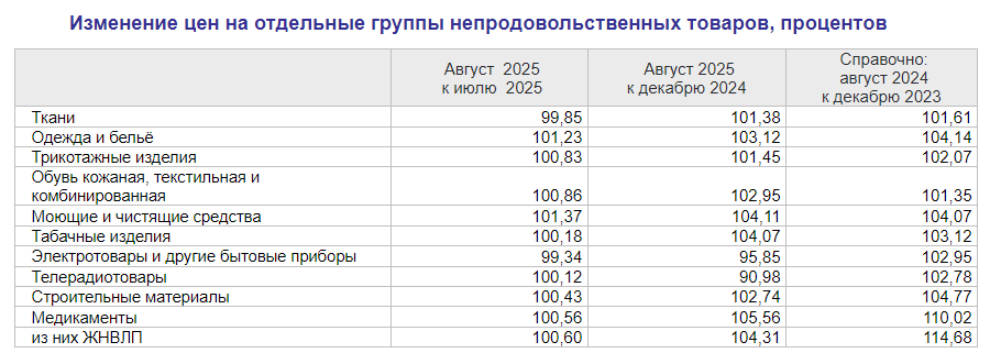 Галантерея, школьно-письменные и канцелярские принадлежности, мебель, стройматериалы, средства связи, ювелирные изделия подорожали на 0,1-7,4%. Стоимость медицинских товаров выросла на 0,5%, медикаментов, в том числе ЖНВЛП, — на 0,6%. Газовое моторное топливо выросло в цене на 0,4%, дизельное — на 0,1%, бензин— на 1,3%.